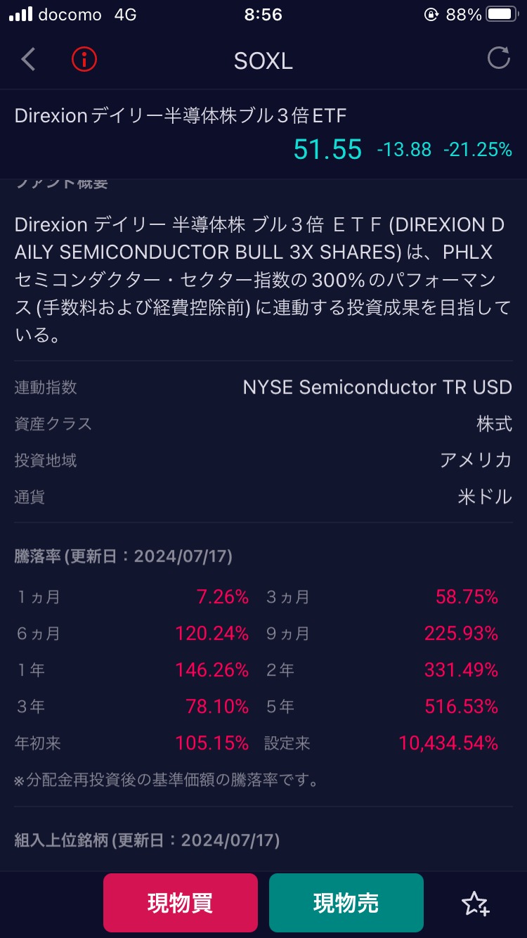 暴落直前のSOXLのパフォーマンスをスクショに撮っておきました。7月17日付のスクショです。